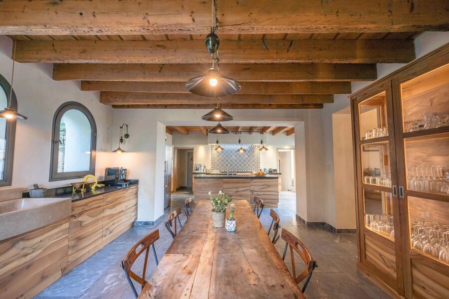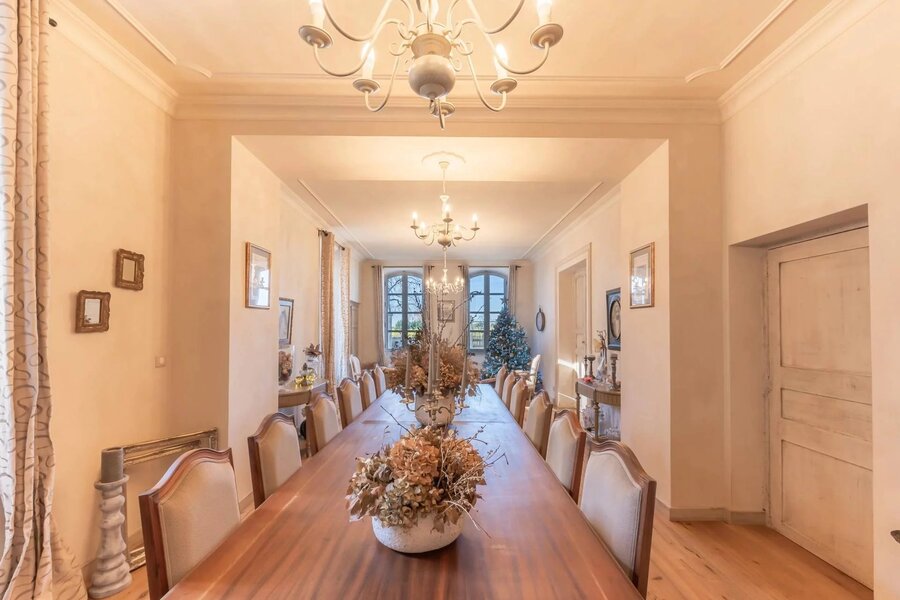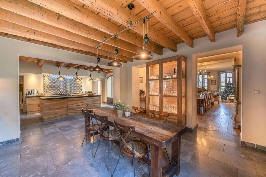 Vous découvrirez ensuite au rez-de-chaussée, différents espaces de vie : une grande cuisine équipée, un salon avec cheminée, une salle à manger, une bibliothèque attenante, un bureau et une buanderie.