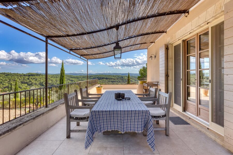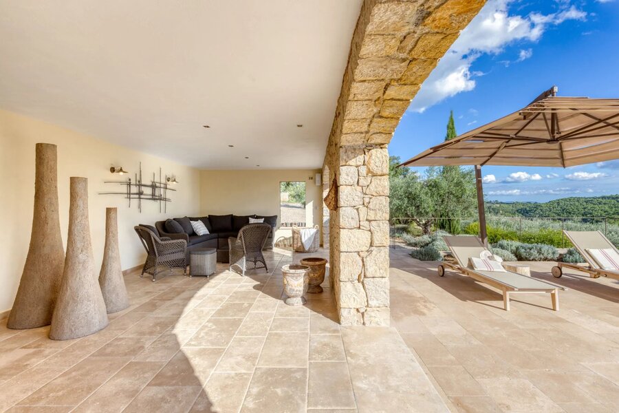 Depuis sa position dominante et orientée plein sud, la villa offre des vues panoramiques et spectaculaires sur le massif des Maures — un véritable tableau vivant qui accompagne le quotidien, des salons de réception aux suites privées. Cinq terrasses, totalisant 416 m², chacune capturant un moment différent de la journée provençale, prolongent harmonieusement les espaces de vie vers l’extérieur et instaurent un dialogue permanent entre élégance intérieure et sérénité en plein air.