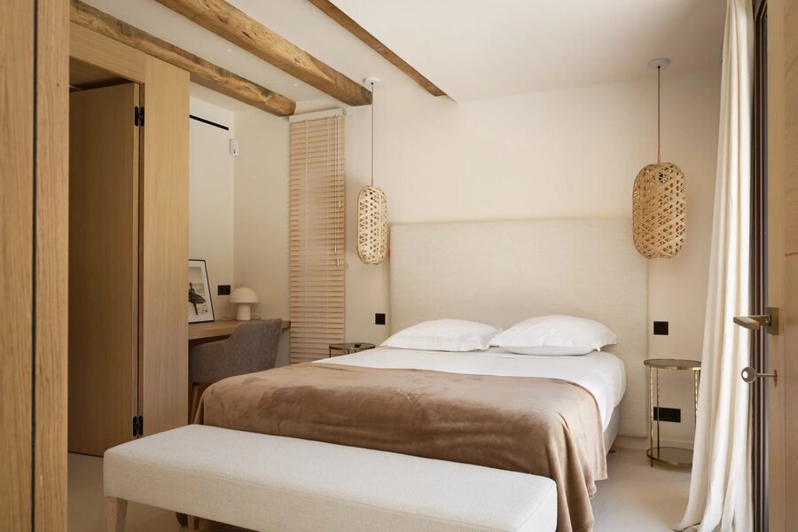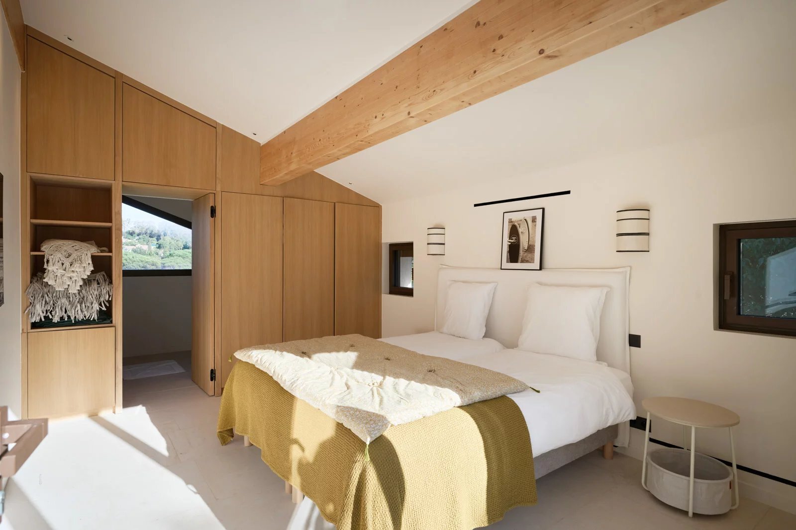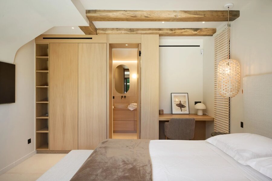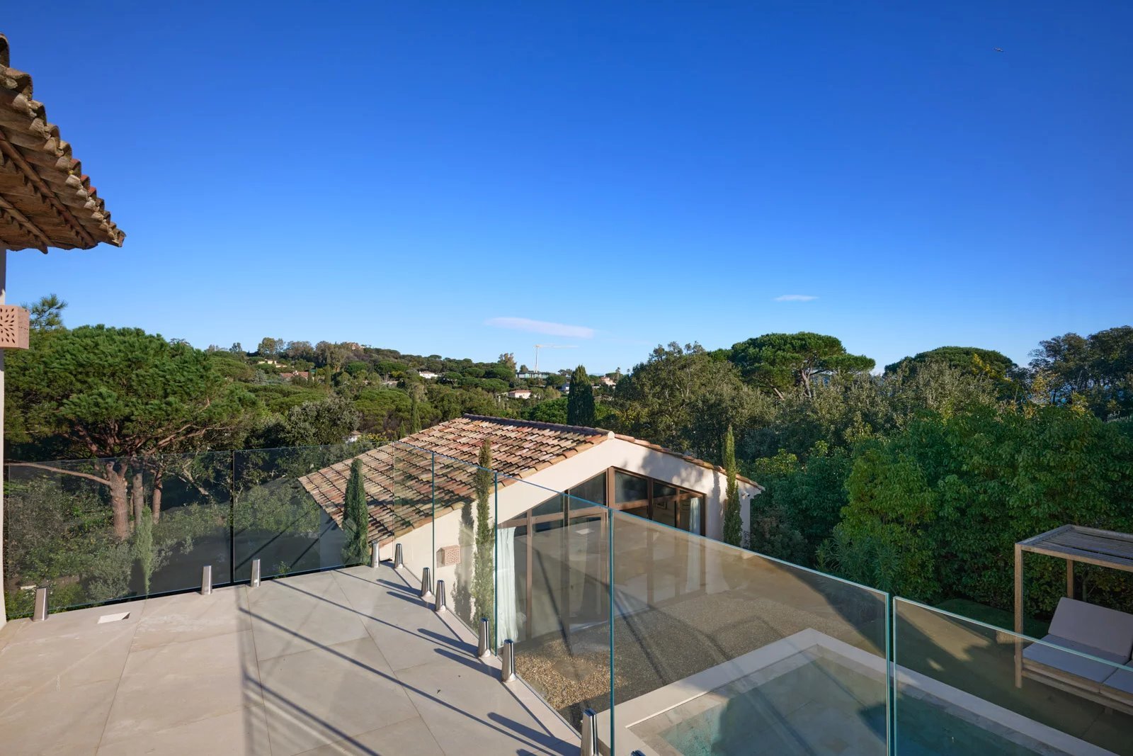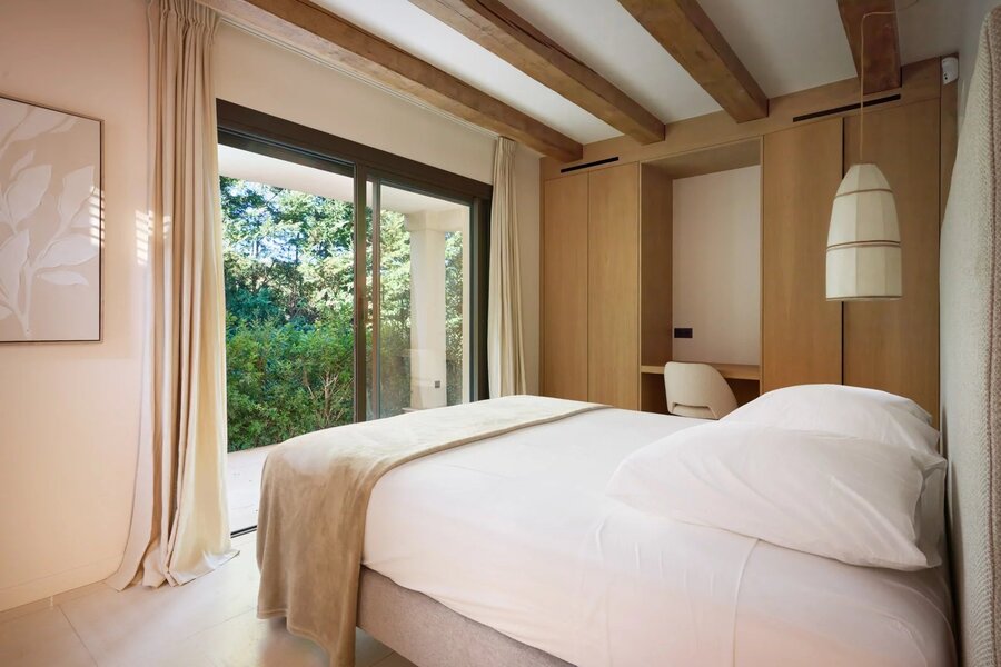 Op de bovenverdieping biedt de master suite royale afmetingen, twee terrassen, een op maat gemaakte dressing en een marmeren badkamer, met een vrij uitzicht op de pijnbomen en een zeezicht op de achtergrond.