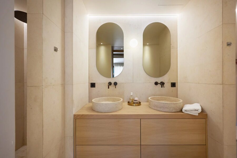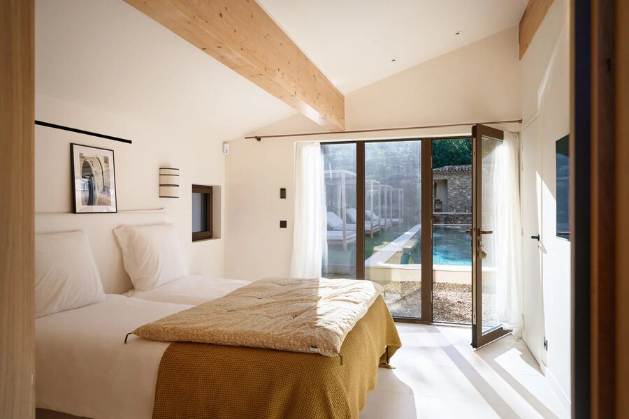 De gastenwoning omvat twee en-suite slaapkamers die uitgeven op het spiegelzwembad, terwijl een servicekamer met badkamer het geheel compleet maakt.