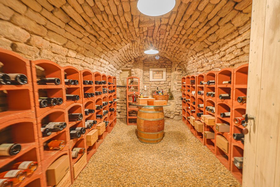 De kelderverdieping omvat een mooie gewelfde wijnkelder van 13 m², een volledig ingerichte en uitgeruste wasruimte, een gastentoilet, een vestiaire onder de trap, een technische ruimte en een garage van 32 m² met mezzanine en automatische poorten.