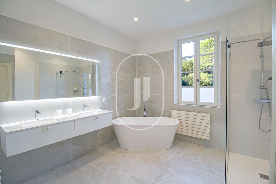 Buiten biedt de tuin van meer dan 4.500 m² een charmante aangelegde omgeving. Een ruime terras, ideaal voor buitenmaaltijden. De tuin is voorzien van een 12 x 6 m zwembad, beschermd door een elektrisch luik. Het park bevat diverse mediterrane soorten: een eeuwenoude plataan, een treurwilg, appelbomen, perenbomen, vijgenbomen, enz.
