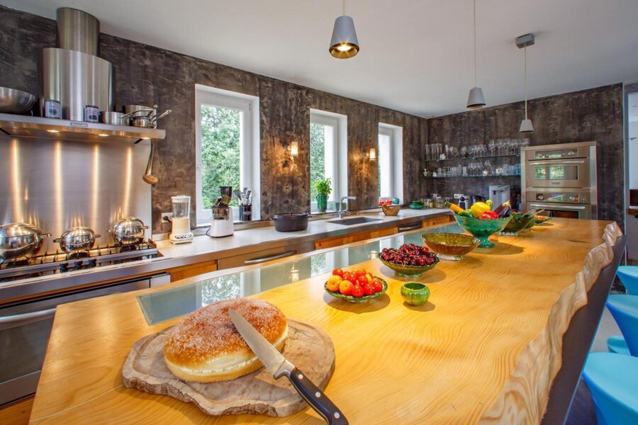 Er is een professionele keuken op de begane grond met grote ramen waar het licht rijkelijk binnenstroomt; een lust voor de kookliefhebbers. Vervolgens is er een zitkamer, eetkamer van 45m², 2 slaapkamers en een badkamer. Op het tuinniveau vind je een wijnkelder, wasruimte, bureelruimte, TV kamer en een studio van 25m².