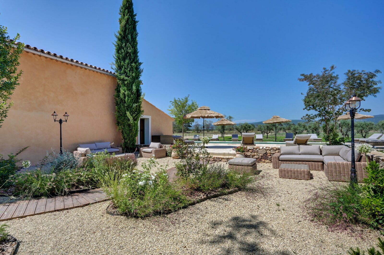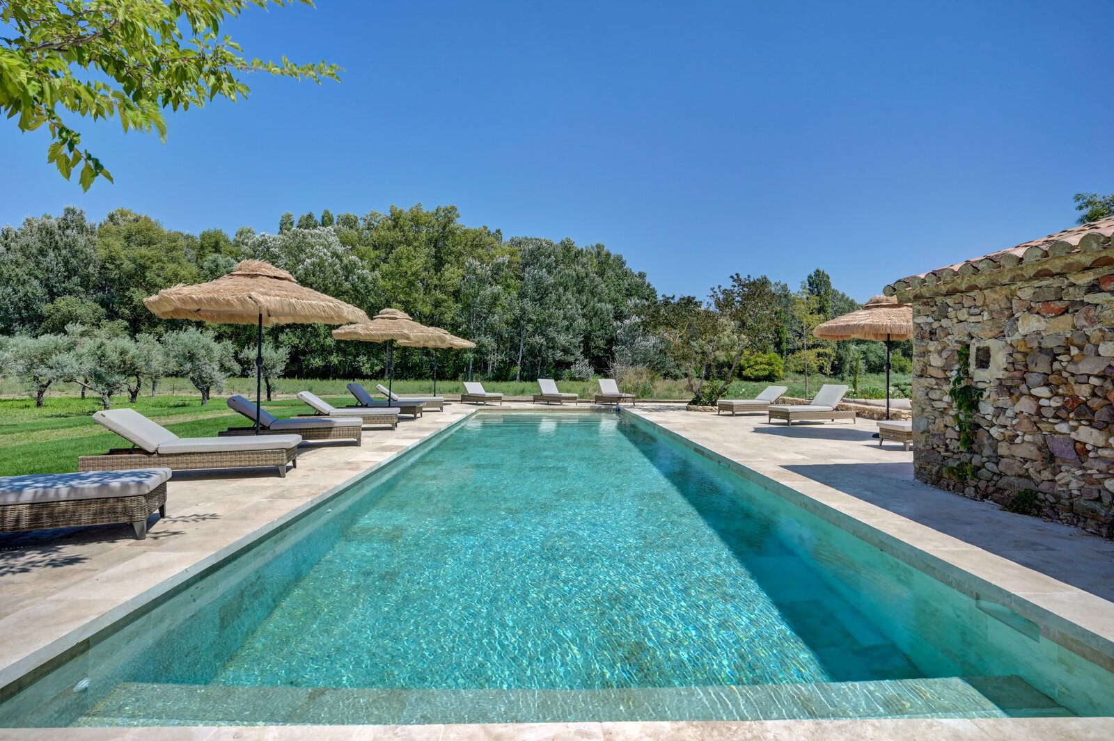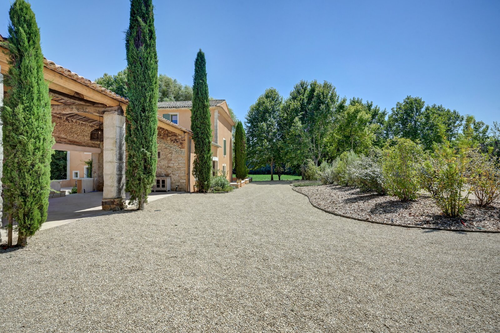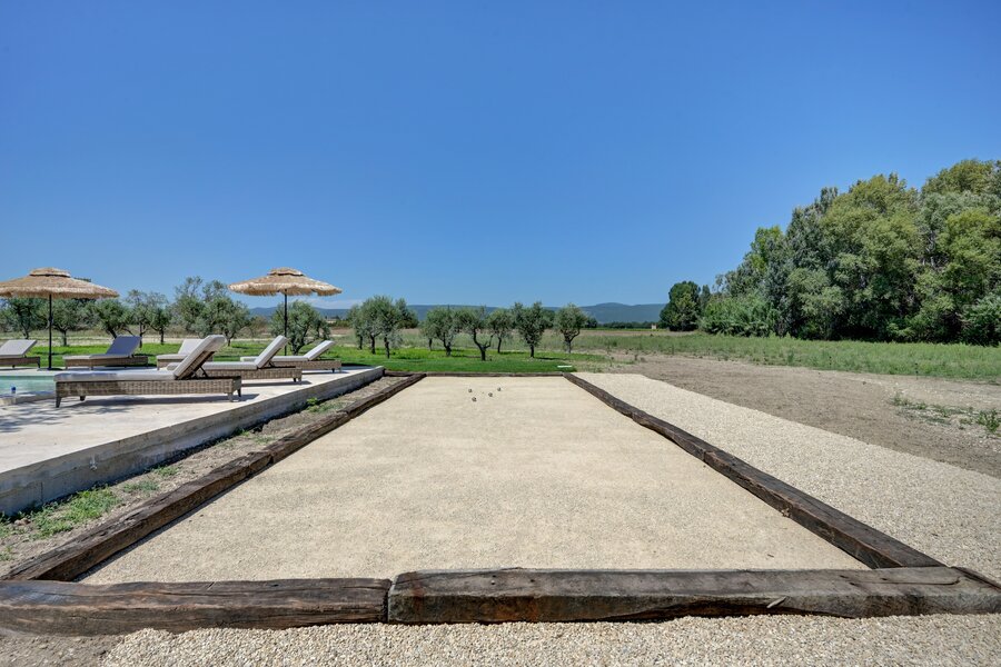Het privédomein van meer dan 4 hectare omvat een imposante platanenlaan, verzorgde tuinen, ruime terrassen in natuursteen, een verwarmd zwembad van 16 x 4,5 m, een lounge van 100 m² en een overdekte zomereetkamer van 90 m². Verder zijn er een schuur, een garage voor meerdere voertuigen en een jeu-de-boulesbaan.