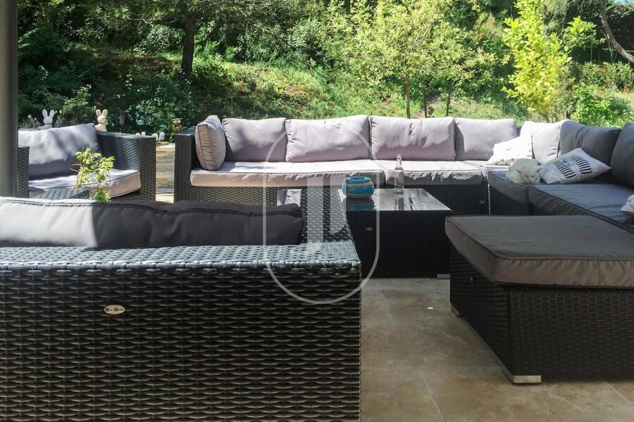 Buiten omringt een uitgestrekt, bosrijk perceel van ongeveer 2400 m² de woning, wat een groene en beschermde omgeving creëert. Het zwembad en het terras met een barbecuegebied bieden een ideale plek voor familiebijeenkomsten in de buitenlucht.