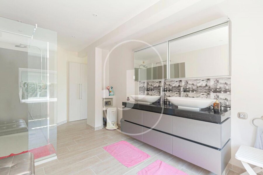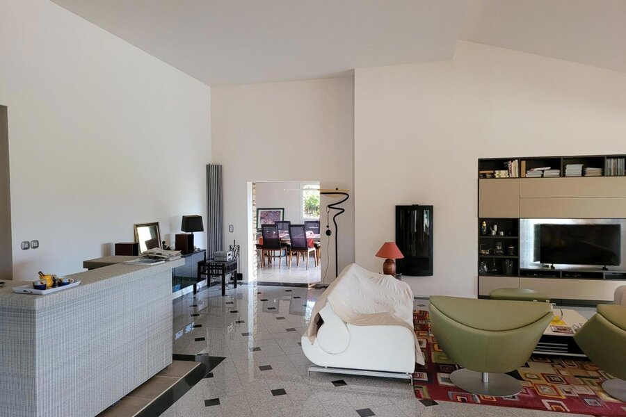 De woonoppervlakte bedraagt ongeveer 250 m². Op de begane grond : een ruime inkomhal van 24 m² met een groot raampartij van 4 meter hoog en marmeren vloer, een grote en luchtige zitkamer die uitgeeft op de modern ingerichte keuken met een keukenhoek. Vervolgens is er een slaapkamer suite van 32 m² met dressing en douchekamer. De bovenverdieping biedt plaats aan 2 bijkomende slaapkamers, waarvan 1 met een terras, een gemeenschappelijke douche-/badkamer en apart toilet. In de tuin zijn er 3 bijgebouwtjes, ingericht als bureelruimte (kan een extra slaapkamer worden), garage/wasruiimte en een technisch lokaal dat dienst doet als atelier.