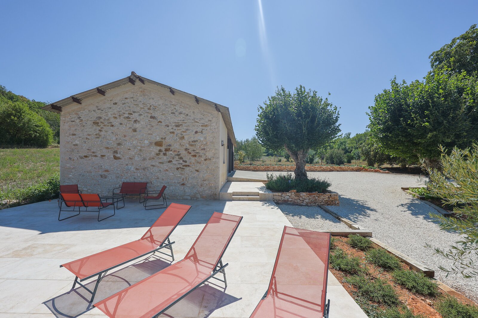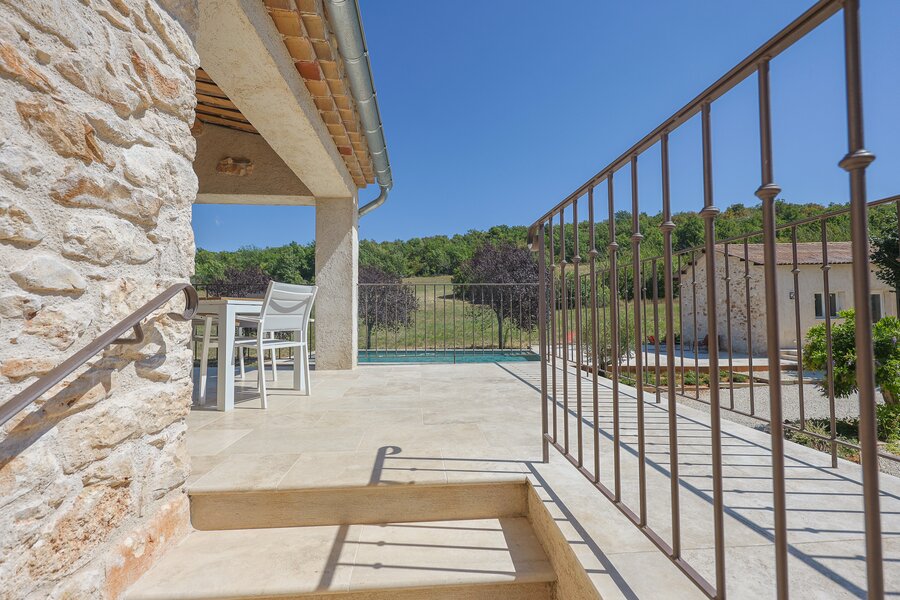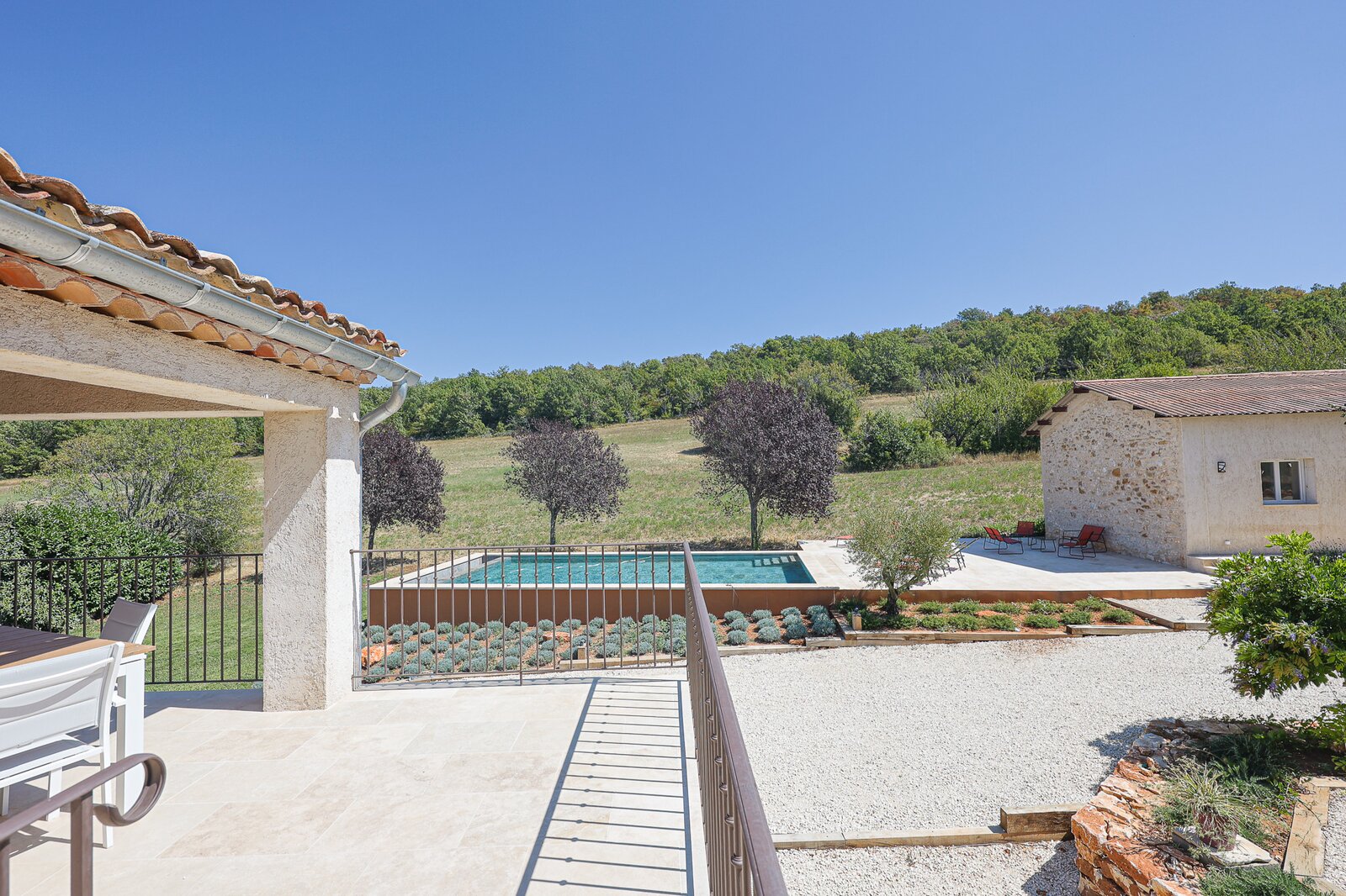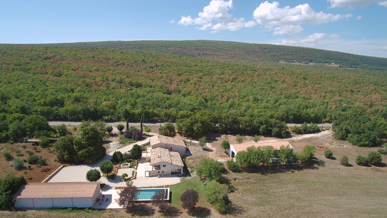 Op korte loopafstand bevindt zich een bijgebouw van 125 m² en een zwembad. Het beschikt over een badkamer, een grote technische ruimte, een garage en een overkapping voor meerdere voertuigen. Het betegelde zwembad, grenzend aan het terras, kijkt uit op de horizon en biedt een prachtig uitzicht op het huis en de heuvels.