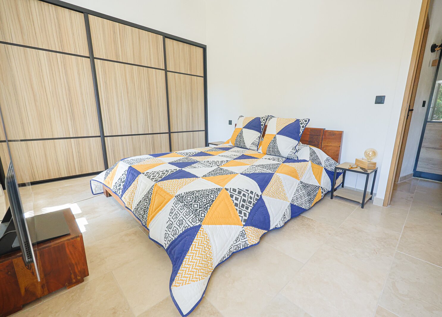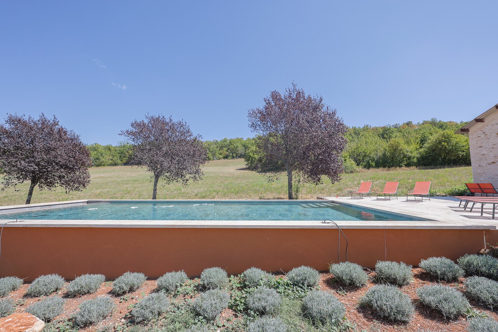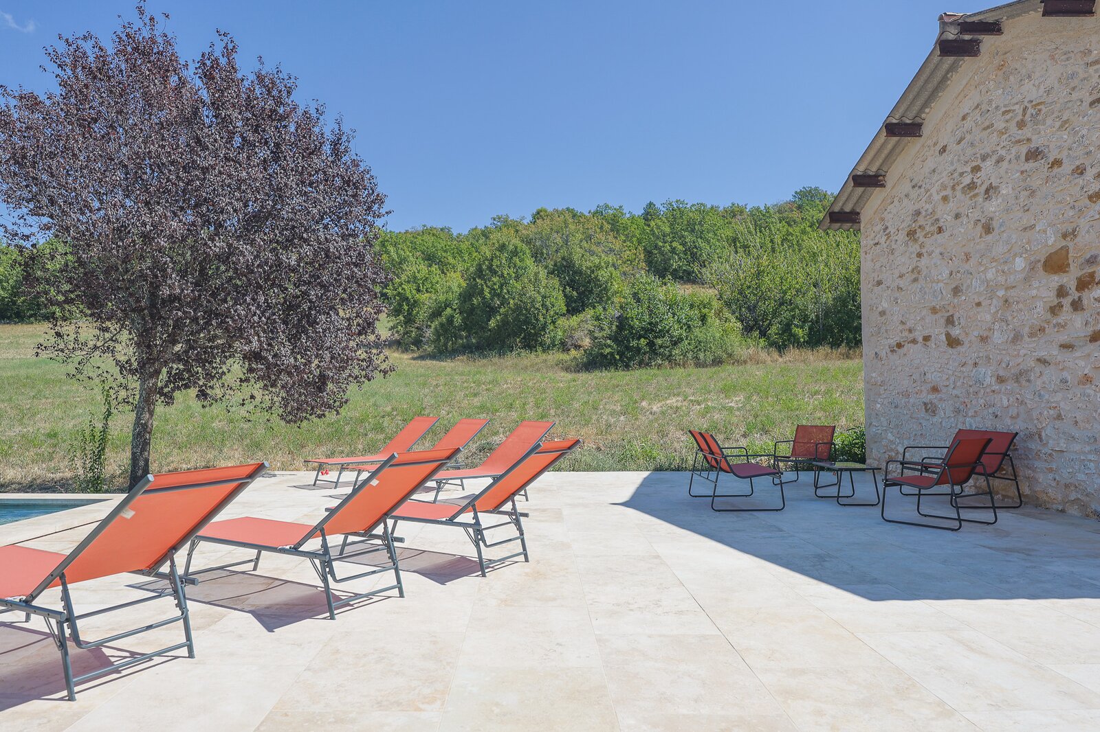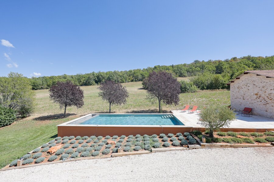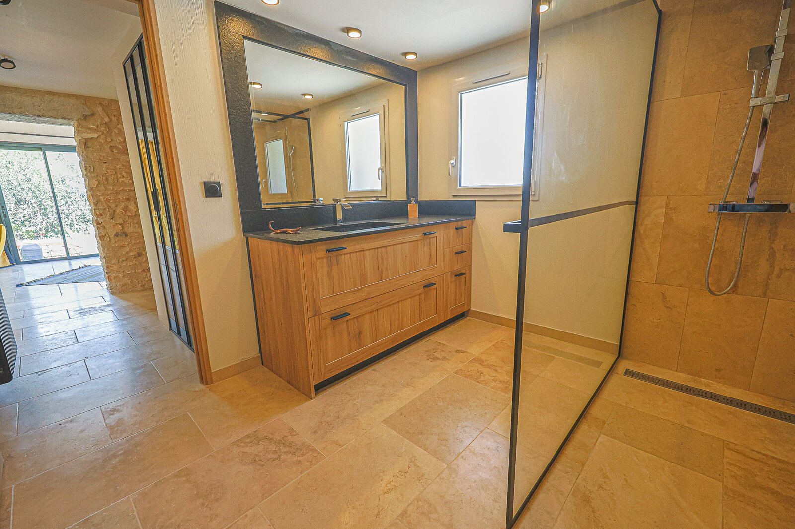 Op korte loopafstand bevindt zich een bijgebouw van 125 m² en een zwembad. Het beschikt over een badkamer, een grote technische ruimte, een garage en een overkapping voor meerdere voertuigen. Het betegelde zwembad, grenzend aan het terras, kijkt uit op de horizon en biedt een prachtig uitzicht op het huis en de heuvels.