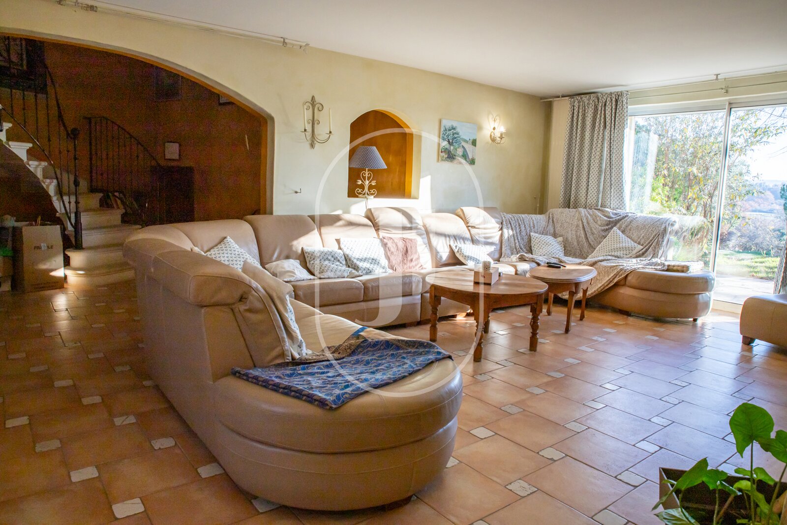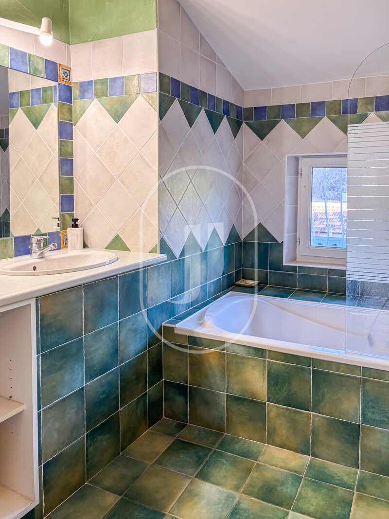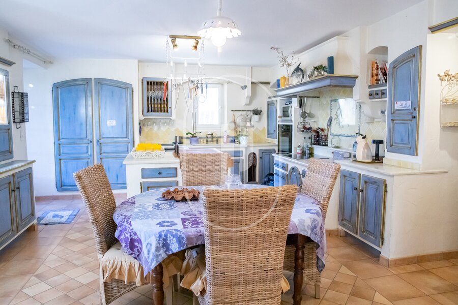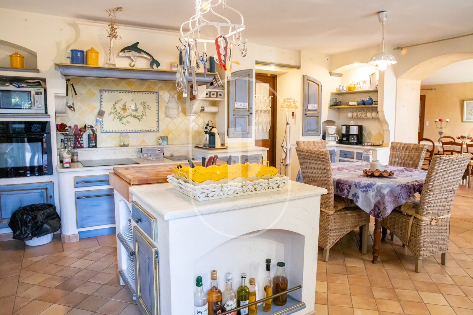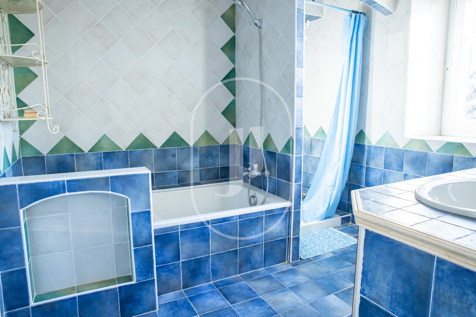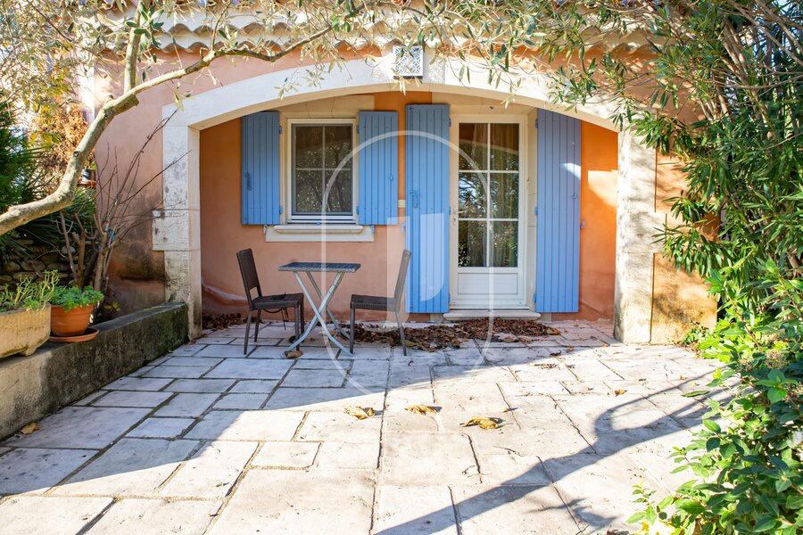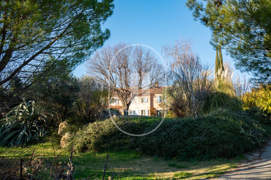 De buitenruimtes bieden een aangename Provençaalse omgeving met meerdere terrassen, een groot zuidterras met pergola, een bebost gebied met stenen muurtjes en smeedijzeren details, een jeu-de-boulesbaan en een aangelegde tuin met fontein en kleine vijver. Het overdekte terras met zomerkeuken en het zwembad completeren deze gezellige buitenruimte, met een rustige en groene sfeer.