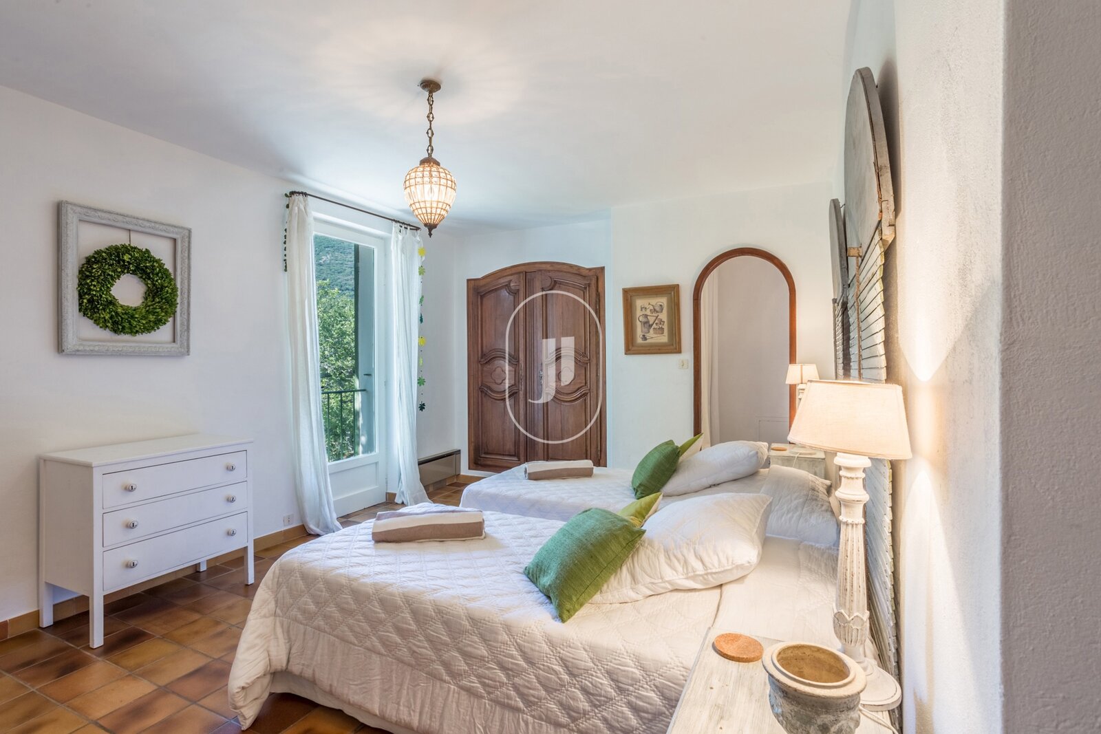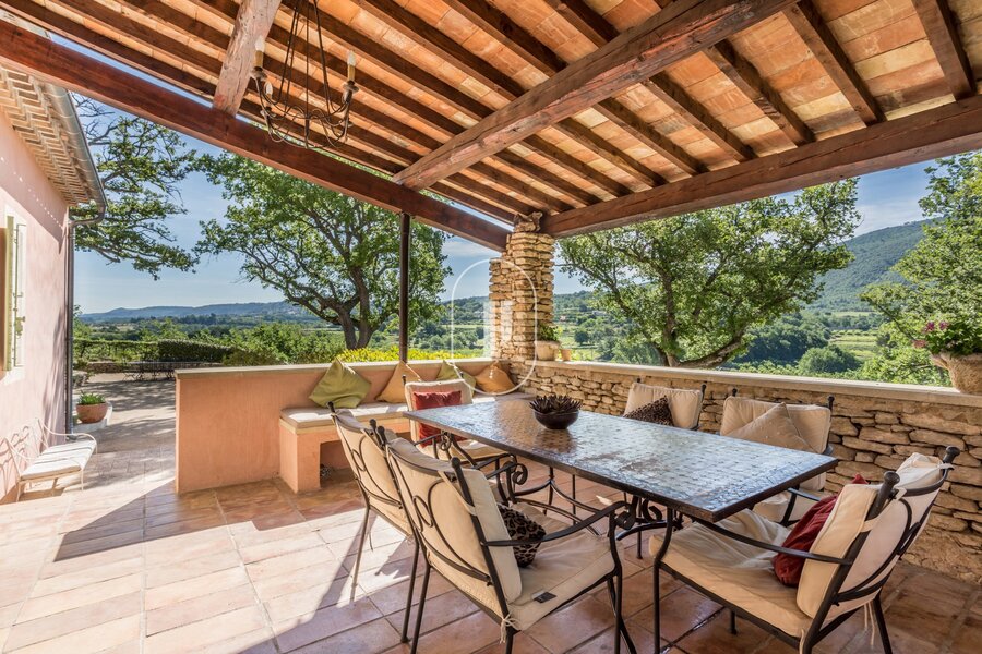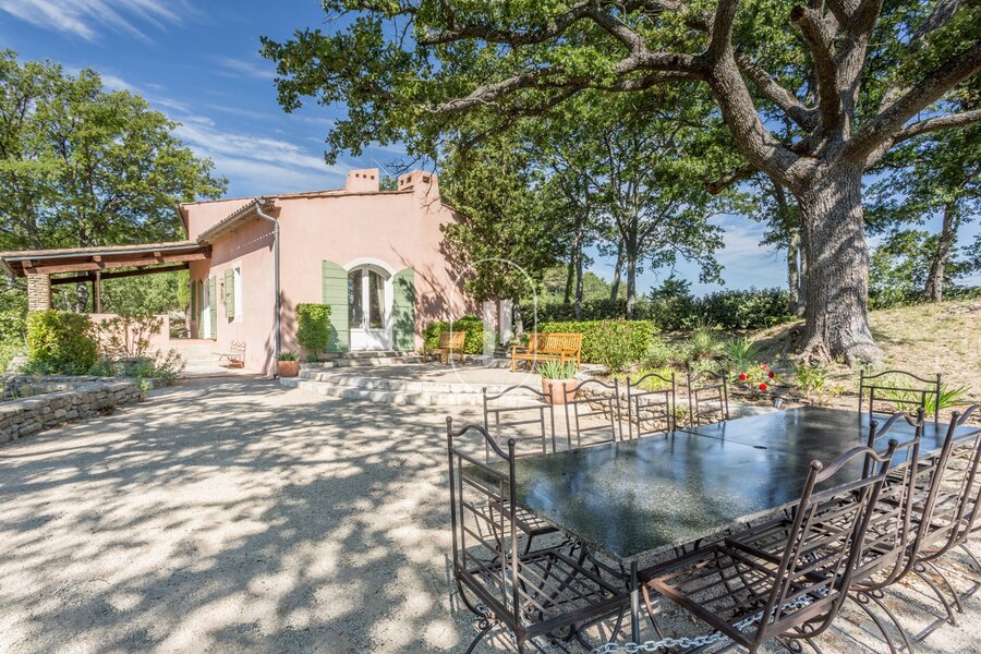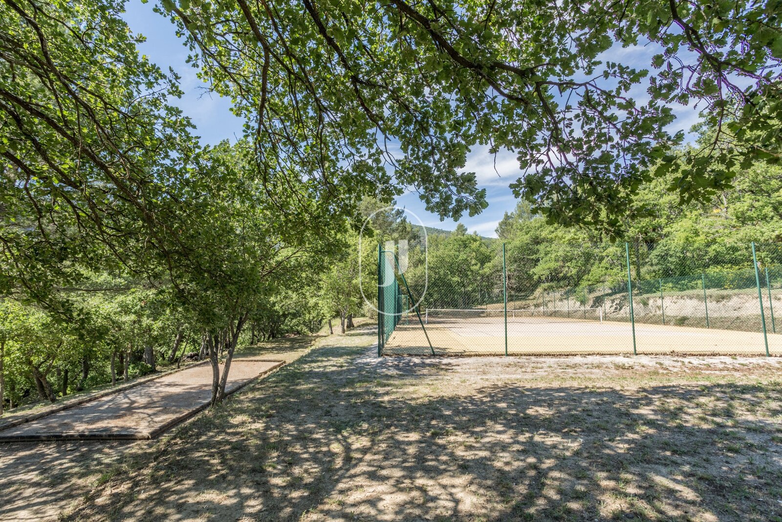Prachtige villa met zwembad en tennisplein te koop, gelegen op een eigen grondstuk van ongeveer 1,4 ha, in een dominante positie tussen de dorpen Bonnieux en Lacoste, in een rustige omgeving omringd door eeuwenoude eiken en wijngaarden, met een 360°-uitzicht op de omliggende dorpen, de Mont Ventoux en de Luberon.