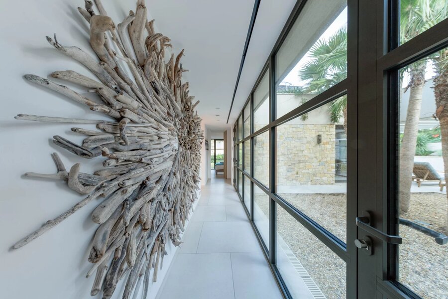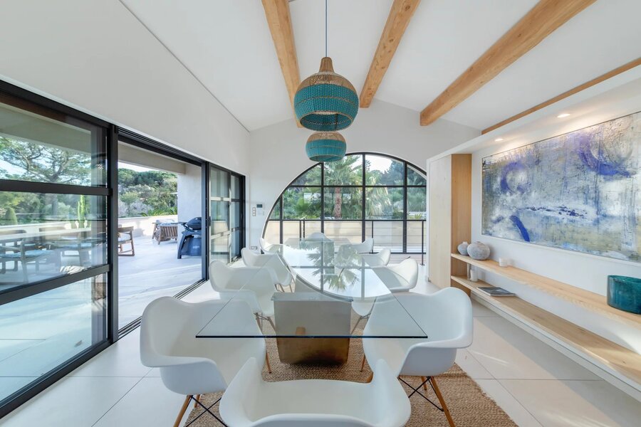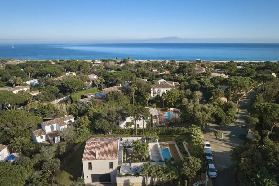 De villa is gebouwd in 2021 in een maritieme stijl, waarbij de decoratie is gehuld in witte, blauwe en turquoise tinten, terwijl de afwerkingen van natuurlijk hout en drijfhout een ware ode vormen aan de natuur en de zee. De villa bevindt zich in het hart van de baai van Pampelonne, op slechts een steenworp afstand van het strand, met een prachtig uitzicht op zee.