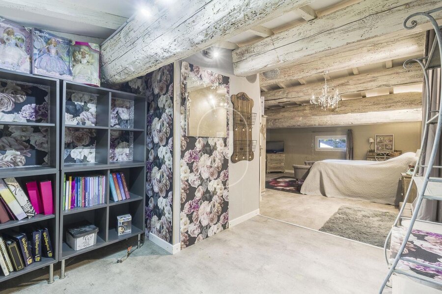 Op de begane grond is er een eetkamer van 42m², gevolgd door een grote keuken en een zitkamer (met mogelijkheid om een open haard te installeren), een wasruimte, dressing, 3 slaapkamers van ongeveer 12 m² en een badkamer met dubbele wastafel, douche en bad.