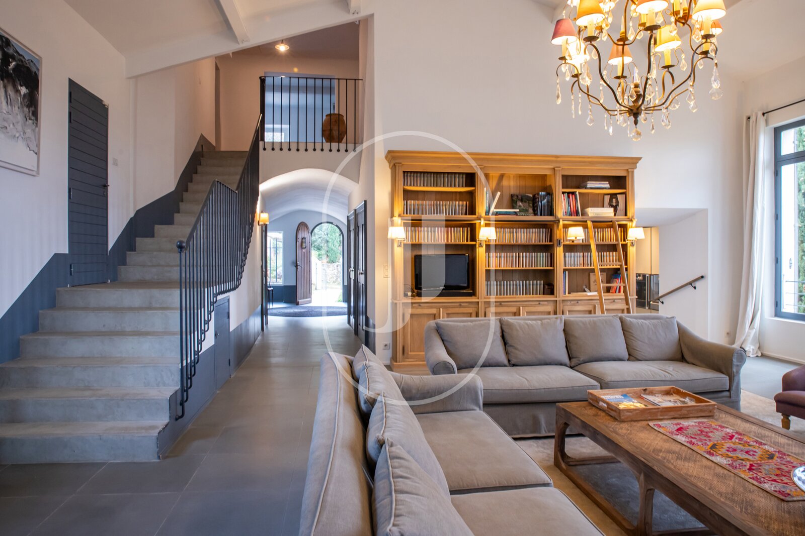 De hoofdwoning is georganiseerd rond een karaktervolle tuinverdieping met een gewelfde entree, gangen met bergruimte, een gewelfde provisieruimte en wasruimte, evenals een hoogwaardige ingerichte keuken die uitkomt op ruime ontvangstruimtes. De kathedraalachtige woonkamer, licht en indrukwekkend, opent naar een eetkamer die wordt verfraaid door grote boogvormige stalen ramen, wat zorgt voor een warme en elegante sfeer.