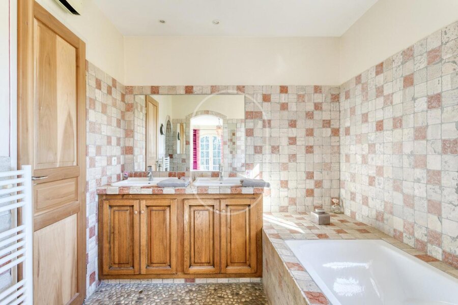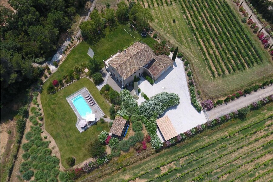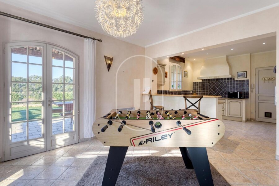 Gelegen in een rustige omgeving van wijngaarden en groen, ontdekt u deze charmante Provençaalse bastide te koop, met een oppervlakte van ongeveer 250 m². Het huis, verdeeld over twee verdiepingen, overtuigt door zijn royale ruimtes en lichtinval. De hal leidt rechtstreeks naar de leefruimtes: woonkamer, eetkamer en een open, volledig uitgeruste keuken. Deze ruimtes genieten van hoge plafonds. Daarnaast is er een bijkeuken/wasruimte en een gastentoilet.