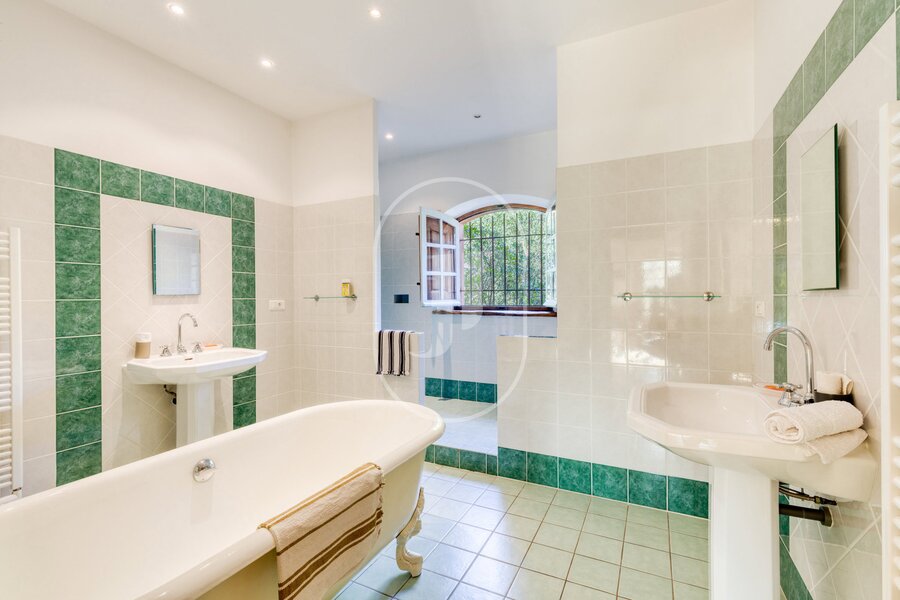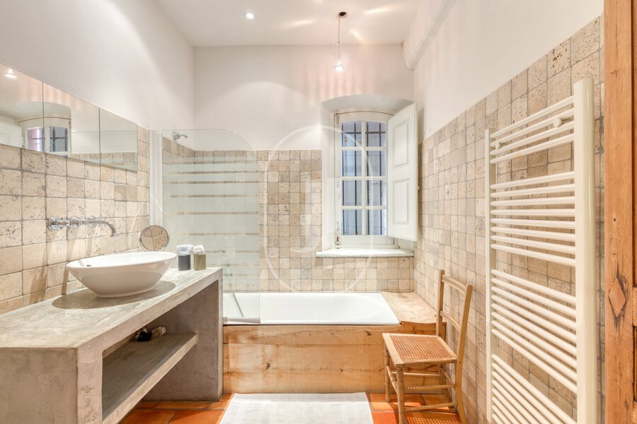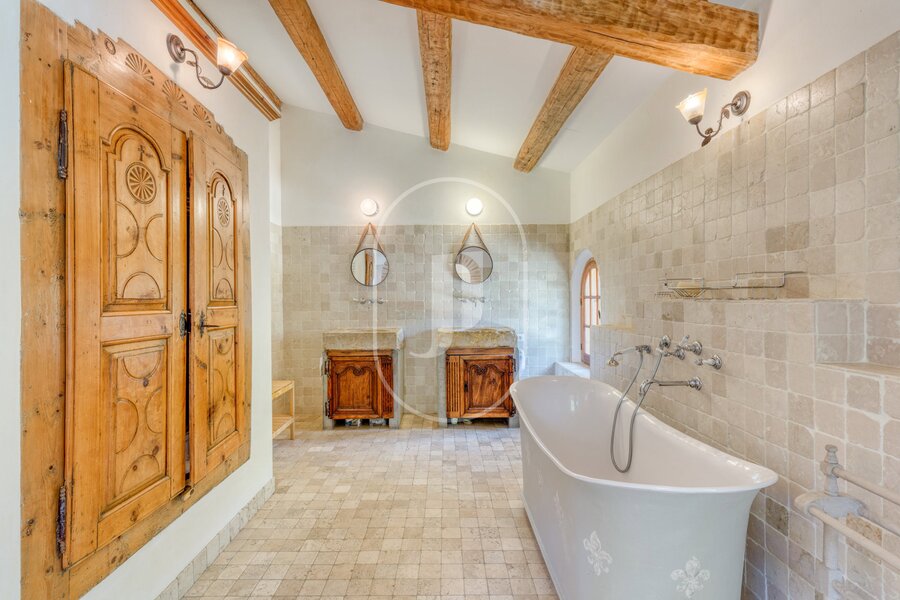 Buiten baadt de bastide in het warme Provençaalse zonlicht. De zachte rozetinten van de gevels passen perfect in het landschap van eeuwenoude bomen en geurende kruiden. Met acht hectare aan ongerepte natuur rondom geniet je hier in alle privacy.