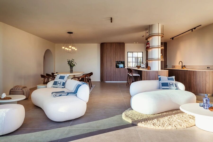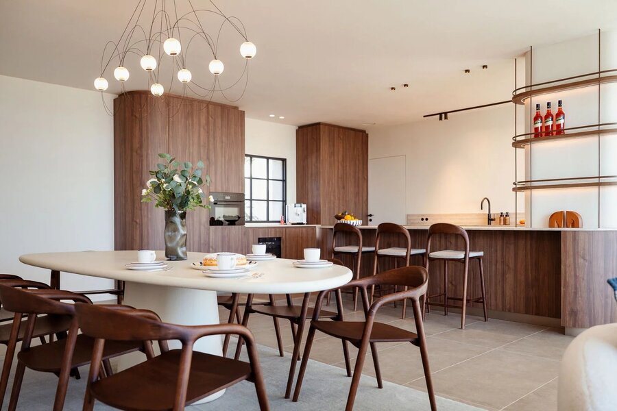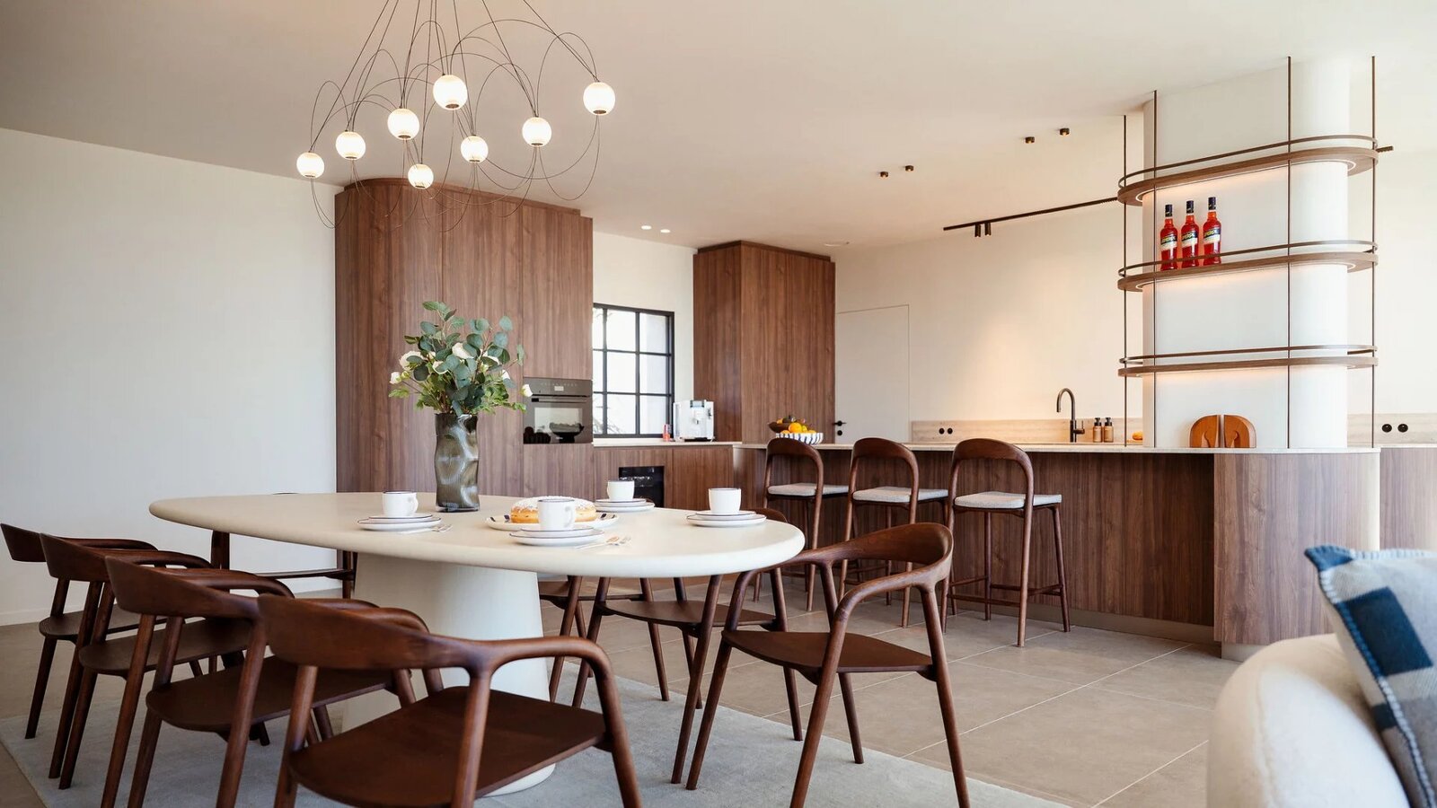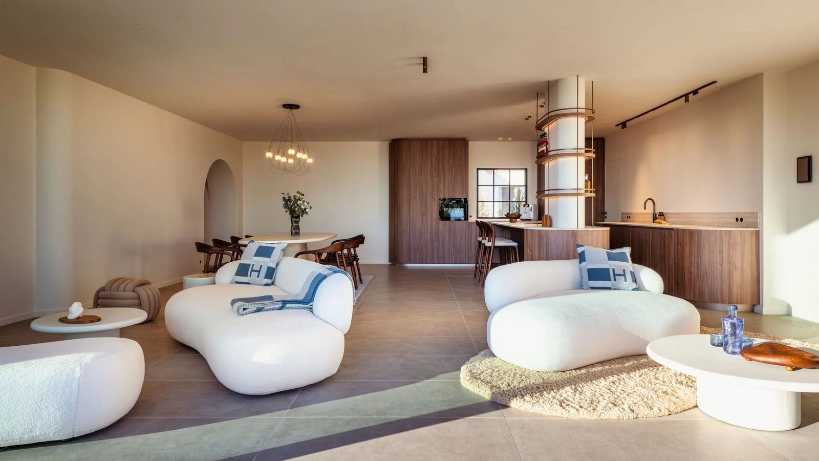 De leefruimtes zijn opgebouwd rond een volledig uitgeruste open keuken, die naadloos overgaat in de woonkamer en eetruimte. Grote raampartijen verbinden het interieur met de buitenruimtes, waardoor u optimaal geniet van de terrassen en het uitzicht.