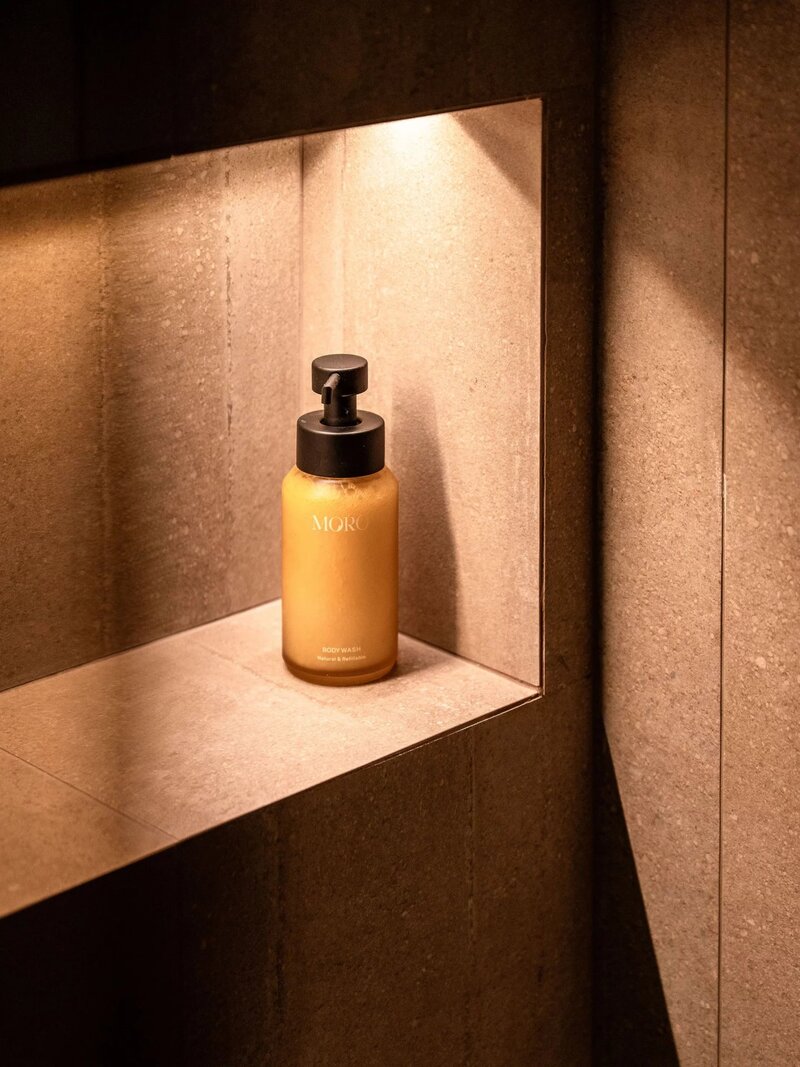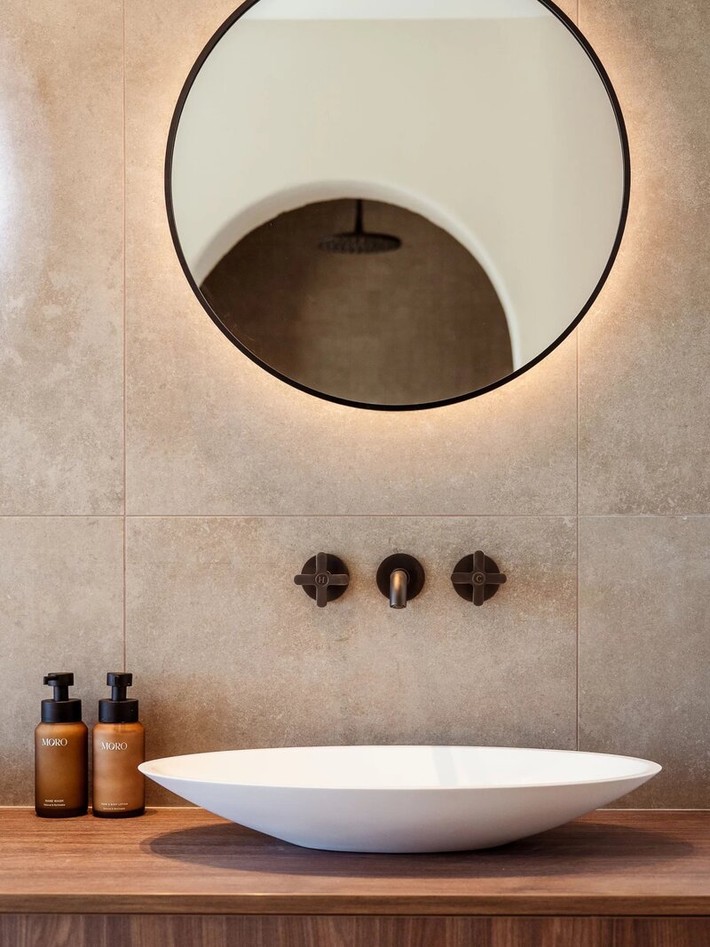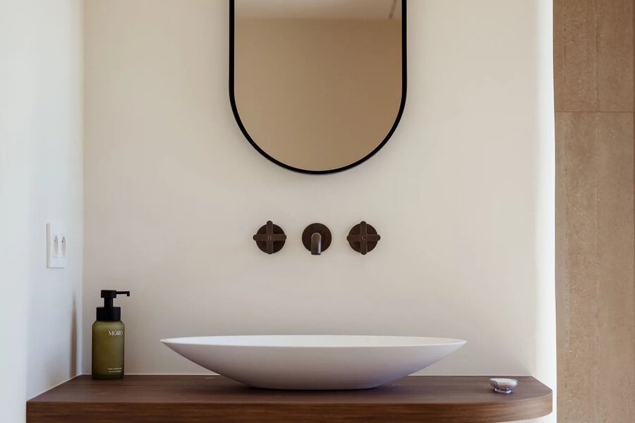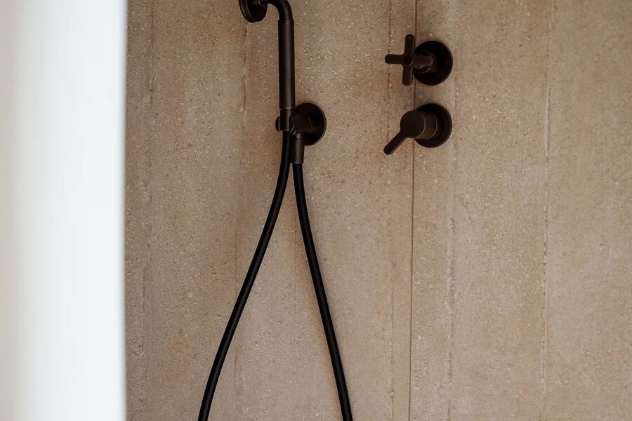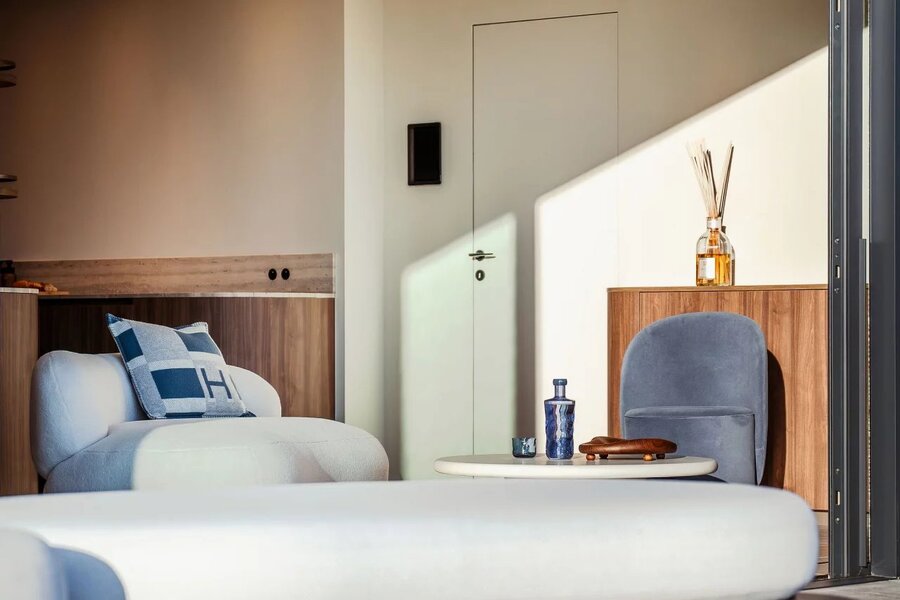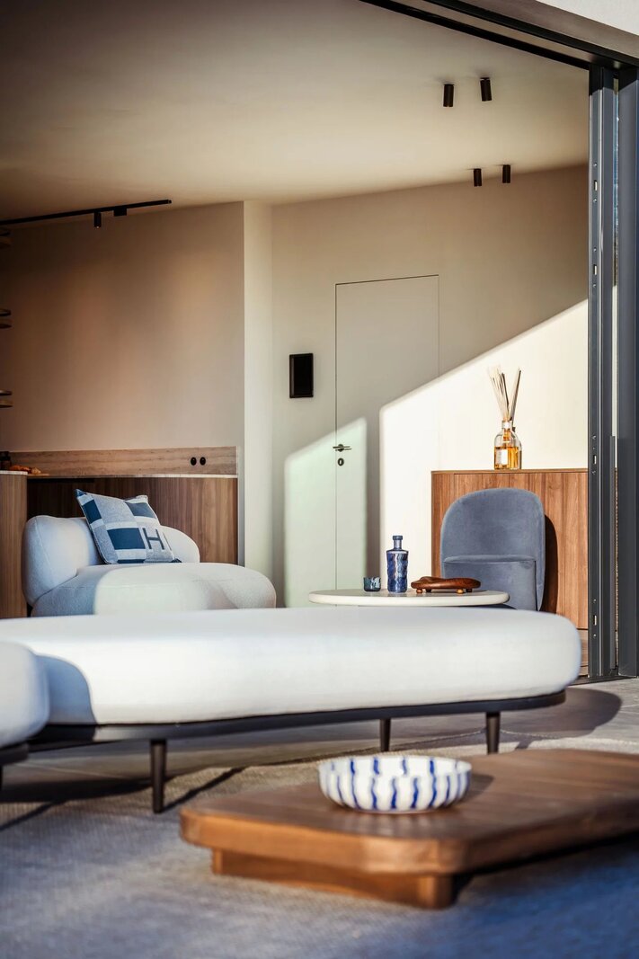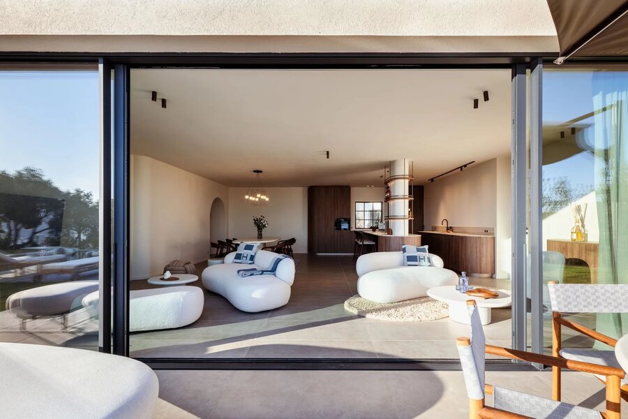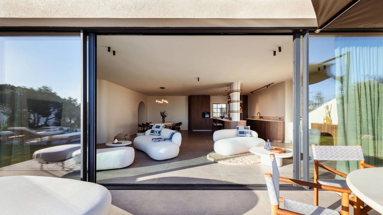 Buiten vormt het overloopzwembad een natuurlijke verlenging van het landschap en biedt het een open zicht op zee, ideaal voor ontspanning in alle rust.